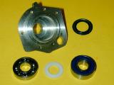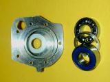Photos 7 and 8 show the front cover, bearings, spacer ring, and crankshaft seal (PTFE). The front bearing is of the sealed type, but with one seal removed from what will be the inner side. The next series of shots show the setups and operations required to line-bore the center support for the cam and crankshafts. The mystery part in Photo #12 is just a piece of scrap aluminium angle used to adjust the boring bar bit (foreground) to the precise size required for the camshaft—as shown by a length of 5/16" drill rod supported in the test piece. The test piece was re-used during cam cutting to provide extra support (see Photos #3 and 4 of the Cirrus Camshaft Page).