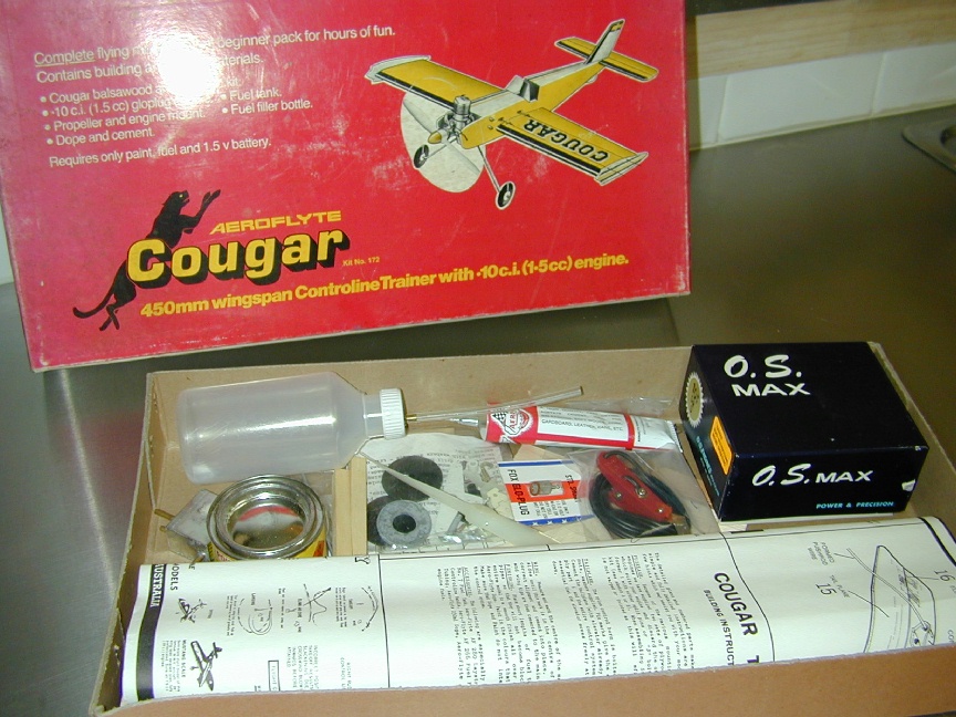 - Aeroflight Cougar Complete beginners kit. Includes OS FS10 C/L engine (NIB), prop, lines, dope, prop, etc, etc. NIB. 65.00
