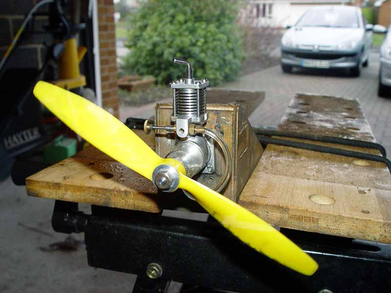 The reproduction is now complete and you'll have to agree, it's a beauty. As a group, The Motor Boys try to be ethical about our reproductions—we don't make them for sale, nor do we part with them, so there is little likelihood of their appearing in less scrupulous hands, being offered as the Real Thing. The tell-tales on Ken's MS 1.2 are: a sand-cast case (original appears die cast), less taper on the front of the fuel tank, and round-head screws as opposed to cheese-heads on the original. The picture captured on the test stand shows the engine running, but as usual, the prop has been strobed into stillness by the flash. I'm busily CADing the engine now, so it will be a future Motor Boy plan.