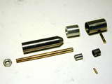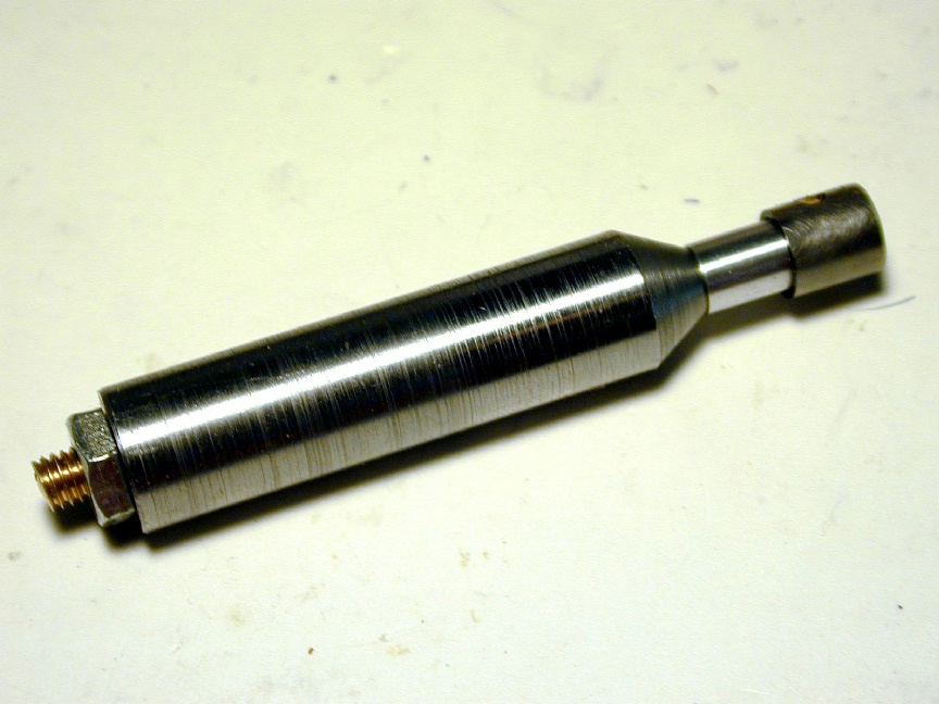 No sooner had last month's Piston Holding Tool Tech Tip hit the web, then the Grand Fromage of Classic Engine Kits, Roger Schroeder, had taken the idea one step further and designed and built a better one. Roger wanted one tool to be able to hold all the pistons he was likely to work on, from the .46cc ED Baby, right up to the 5cc Nova 1. The beauty of Roger's design lies in the accuracy and ease with which the replaceable sleeves can be made. As you can see in this photo, they are fitted to a mandrel with a 60° taper. The female taper is easily produced by a center drill. In fact, the entire sleeve to be turned and parted off at one lathe setup, thus assuring concentricity. After turning down to a close fit in the piston skirt, parting off ensures the seat is normal to the outer diameter. This makes the mounted piston run true enough for honing.