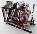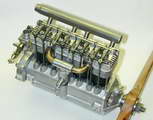 Now isn't that just the prettiest little thing you ever saw? It's a 90° V4 four-stroke designed by Jerry Howell and features on his Model Project Plans and Kits website. The displacement is 32cc and it's a barstock engine featuring "blade and fork" conrods. This allows the cylinders to sit side by side (ie, no stagger). Not so obvious is the full pressure fed lubrication system and magnetically coupled water pump. The outstanding use of color and polished machining really sets off the finish. The exposed rockers add to the crowd appeal too. Plans and construction notes are US$63.00 from Jerry (full contact details on the Suppliers Page). Go to Jerry's web site where you'll find a stack more photos and details. Incidentally, Joe Martin and the team at the Craftsmanship Museum are narrowing down the choices for their next project and this one is starting to look very good to all concerned.