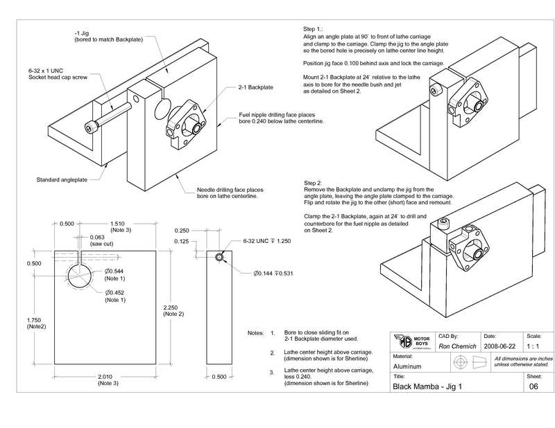 The plans include details of a jig that will greatly simplify one of the critical areas, namely how to align and drill all the holes for the needle valve bush, fuel jet and fuel nipple using a lathe only. All work could be easily accomplished on a small tabletop machine like the excellent little Sherline and the jig drawing has been dimensioned for this lathe. Owners of larger machines can easily adapt the jig from the data provided. Builders will need castings for the crankcase and backplate. Dirk Tollenaar who supplies the Bob Shore PeeWee kit is looking into supplying these, and an option, if practical, to include a finished needle valve bush tapped with the unusual and very fine 4-80 thread.