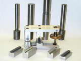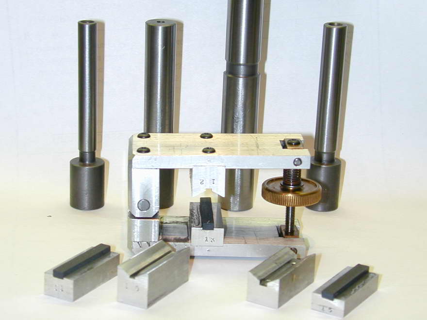 And finally we come to David's version. Instead of using castings, or CNC, Dave has simply fabricated the adjustable frame from flat aluminum plate, screwed together with button head Allen key screws. The guide and stone blocks fit into carefully milled channels, just like the prototypical tool, and the spring loaded adjusting screw works in precisely the same way as the original (the adjustment is so the tool springs apart enough to clear the work; closing pressure is applied by finger pressure). Dave has made a range of guides and truing sticks to cover the size of pistons he normally expects to work with.