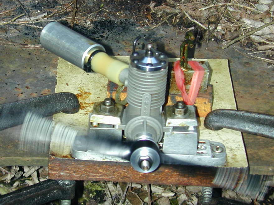 The difference in volume and pitch between the silenced and unsilenced state of the Owen 2.8SP is nothing short of remarkable. The muffler just pushes over the circular exhaust with a piece of silicon tube. This allows it to be pulled off to drain the oil (it's a baffle chamber type) and Dave says he's never had one fall off while running. Would be a great crash resistance feature on a combat model too. The device on the rear is a cut-off, not a throttle as the engine is intended for Texaco events. Dave has a batch under construction and we'll let you know when he's ready to accept orders.