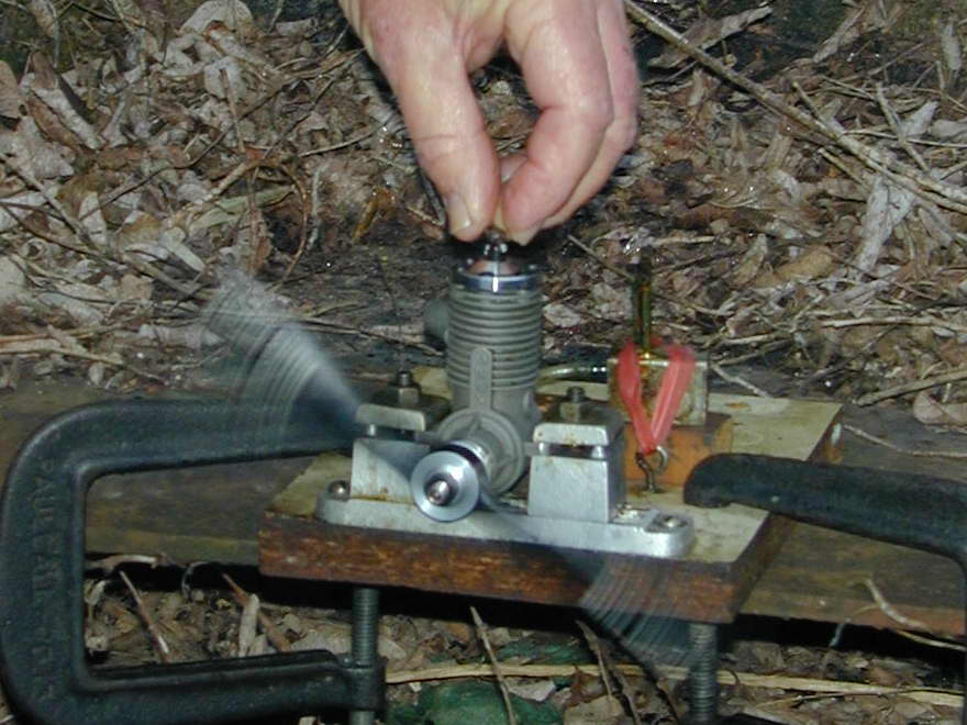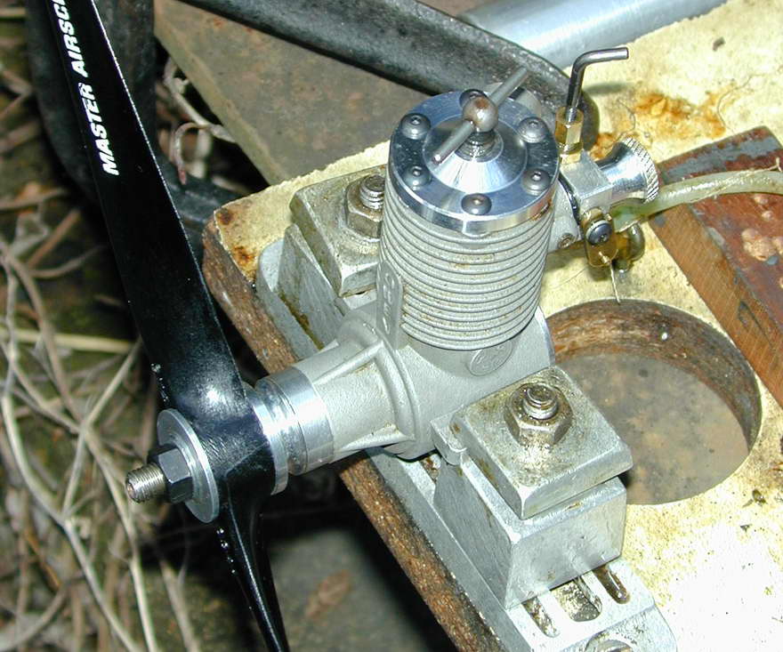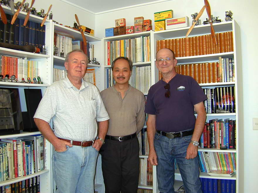 Following the fine get together with Adrian Duncan in Canada last month, Motor Boys Dave Owen and Vincent Chai dropped by for a visit in Brisbane during June. The photo shows, left to right, David, Vincent, and moi in the MEN Only Library and Engine Fondling Den. We went out to the Thunderbirds C/L Club field in the morning so they could watch me get blown out of every vertical maneuver I was foolish enough to try in the wind, then we had a fine lunch, followed by some engine fondling. Both Dave and Vincent ran their twin ball-race, side-port diesels at over 18K rpm, a speed which many believe no side-port is capable of! Vincent's screamer is a refinement of a venerable Model Engineer design he calls the Battiwallah Spacial. Dave's was one of his 2.8SP Limited Edition diesels described here way back in the December 2003 issue. The photos below show the latter bolted to my Bar-B-Q plate. It's not as evil as it sounds—that plate can no longer be used for the stated purpose as open, out-door fires of all types have been banned by our nanny-state. I wonder if the legislators involved have a connection with any of the gas fired Bar-B-Q supply business that have sprung up like mushrooms? But then again, perhaps I'm just too grumpy, old, and cynical.