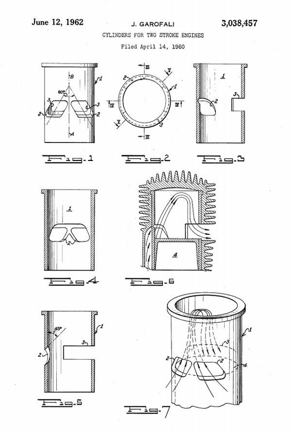 As an example, here's one sent to me by David Burke, Grand Fromage at Adelaide Aeromotive, makers of Taipan reproductions. The patent was filed in 1960 by J Garofali, whom readers may recognize as Mr Super Tigre, and deals with a form of transfer port cutting to provide a loop-flow scavenge pattern without the use of a piston baffle (you could argue it's cross-flow, but with the transfer port opposite the exhaust). Notice that the patent date is 1962 indicating that the process took two years to cover five countries. David believes that Gordon Burford, designer and builder of the Australian Taipan and Glow Chief range of engines was toying with this style of porting, but gave it up when made aware of the Garofali patent. Click here for the full text of US patent #3038457 as a pdf.