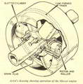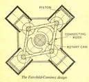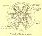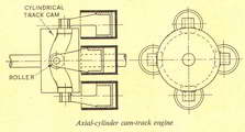 The substitute for the normal crank has usually been a swashplate or equivalent device, which produces an axial or arcuate motion of the pistons. Alternatively, there have been a few examples of engines in which the pistons, or extensions thereof, bear directly or indirectly on formed cam tracks which control their order of movement. This is sometimes done to vary the travel or duration of individual strokes to obtain, theoretically at least, an increase of efficiency. In other cases, multi-lobed cam tracks are used to increase the number of cycles per revolution of the shaft. One such engine employed a wave track on a cylindrical cam which produced eight inward and outward strokes of each piston per revolution--equivalent to using a reduction gear of 8 : 1 ratio. Generally, such engines have failed to show any improvement over those with conventional cranks and connecting rods-rather the reverse, in fact, because of the lower mechanical efficiency in transmitting motion through cams. Thrust loadsEven when ban or roller races are used as the thrust members, both the axial and side thrusts are difficult to cope with: and so far as i.c. engines are concerned, they have never attained practical success. At one time, cam-track engines operating on air pressure were popular for portable tools, where compactness was more important than economy, but they have now been superseded by rotary motors of the vane type, Which have no reciprocating parts and no valve gear. Axial piston motion, though usually favoured in cam-track engines, is not an essential feature; some engines have had peripheral cams producing a radial movement of one or' more pistons. They are less compact than the axial type, and if the cams are made to control piston movement in both directions, their construction is also more complicated. Complication is often necessary for Lc. engines, though not for single-acting steam or air motors. Both axial and radial cam-track engines have been made in "static" and "rotary" types; the latter term, as explained in previous articles, is somewhat ambiguous, though in engines with reciprocating pistons, it means that the engine structure rotates, while the crank or camshaft remains stationary. As Einstein told us, it is all a matter of relativity. But it introduces centrifugal force, which can be usefully employed in certain cases, though it is not always an unqualified advantage and may have undesirable effects. An interesting steam engine produced some years ago employed four pistons tangentially located in a rotating member, the centre of which formed a bearing for a hollow stationary shaft. This served as a steam supply pipe, and was ported to form a rotary admission valve. The rotating member was eccentrically mounted inside a circular casing, the inner surface of which formed a track on which articulated slippers attached to the pistons took their bearing, under the influence of centrifugal force. Rotation of the member caused the pistons to move inward and outward once per revolution, their stroke being determined by the eccentricity of the casing. Exhaust could be controlled either by ports and passages in the rotary valve, or by uniflow ports uncovered by the pistons. It is probable that the mechanical efficiency of this "tangento-rotary" engine was low, because of the friction of the piston slippers. Undoubtedly rollers would have been better in this case. One of the most promising cam-track engines-potentially at least was that produced in the Twenties by the Fairchild Aircraft Corporation of America. This had four radially disposed cylinders (or banks of four), the pistons of which were provided with rollers making contact with a large "figure-eight" cam, carefully designed to produce a true harmonic motion of two complete inward and outward strokes of each piston per revolution. Connecting rods between the roller pivots of the pistons tied them together, on the principle of a rhombic parallelogram, so that one opposed pair, in moving outwards, caused the other pair to move inwards, and vice versa. Side thrust eliminatedThis mechanical system imposed no side thrust on the pistons, and loading on the cam and the rollers was relatively light if the contour of the former was properly designed. The engine could be made either static or rotary, with no basic alteration in design. Presumably it did not work out as expected, though it is difficult to understand why; at any rate, it never went into production, so far as I know.A new cam-track engine brought to my notice a few weeks ago embodies some of the features already described, including the outward-mouthed cylinders and rotary valve of the "tangento-rotary" steam engine, and the "figure-eight" cam of the Fairchild-Caminez engine; though the latter surrounds the rotating system, and is internally contoured. The new engine, for want of a better term, described as an " inside-out rotary," is the invention of Mr A. C. Mercer, of Bradford, who has built a six-cylinder working model of 1-1/8 in. bore and stroke (111 c.c. total displacement). It works on the normal two-stroke principle, but as it cannot obtain crankcase compression, it is fed by a rotary blower, which is belt driven. In the centre of the assembly is a stationary hollow shaft. which forms the transfer passage, and has two ports diametrically opposite to control admission to the cylinder. The rotating assembly comprises a hexagonal hub, around which are equally spaced the six open-mouthed cylinders. Each piston is fitted with a roller bearing which engages with the cam track, and as the system rotates, makes two complete inward and outward strokes per revolution. Contact is maintained by centrifugal force which pushes the pistons outwards so that it is not necessary to provide for positive operation both ways. At the outward end of the stroke, exhaust ports, similar to those of an ordinary two-stroke, are uncovered by the piston. A sparking plug is fitted in the side of ea