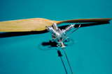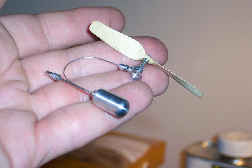 The bore is 2.85mm, Stroke 4.5mm that gives a total volume of 56 cubic millimetres. Tank capacity 3 cc, Flying weight 10.4 grams. Construction is all aluminium except for the crankshaft (Silver steel), Conrods (Brass) and crankshaft bearing (phos-bronze). Piston skirts and valves are made of Acetal. It runs for 2 minutes on a full liquid charge on a moderate to high power setting. RPM is in the region of 4,500 at the beginning of the run. This is my first ever home made motor and I certainly have learnt a lot. Total constuction time spanned 5 weeks. Following this I rashly offered to repair a fellow modellers Gasparin G2.6 co2 motor that required a new piston, the original one having been lost after the conrod no longer remained attached to its socket. This motor has a bore of 1.6mm and a stroke of 1.3mm. I surprised myself by successfully making a new one first time round. The end result of this is that I have also now built a reproduction of this motor! I've been trying to take some pictures but my camera is struggling to focus properly on it! Drilling the exhaust ports was a challenge. It required a home made drill bit 0.15mm diameter and a magnifier! |