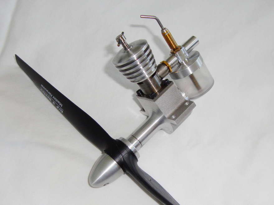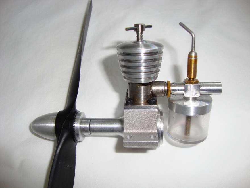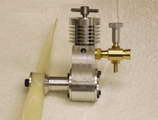 This is the 0.5cc Richard Gordon designed, Alpha, as executed by John Beddard (UK). The engine appeared as a supplement in issue 4047 of the Model Engineer of 18-31 October, 1996. The article accompanying the plans goes into considerable detail of the design process as well as the actual construction. To simplify construction Richard designed the main crankcase to be sawn from 5/8" thick plate with the front bearing glued in with Araldite, a feature employed on the earlier 0.75cc PMC-IMP (a MEN Members' free plan). This can work, though this joint is highly stressed, especially in a diesel, and at 0.5cc (0.03 cuin) displacement, there is not a lot of surface area available to distribute the shock. Wisely, John opted to use small Allen head screws to retain the part. As seen here, John's Alpha runs well, once he increased the size of the fuel feed pipe to cure a case of premature starvation. John says he has not run a "diesel" since he was 10 years old and I'll bet the thrill of running an engine he has built from scratch is just as grat today as coaxing one into life was way back then. |