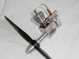 This Nova 1 was made by Ramon Wilson from magazine published plans. Although it is hard to spot, Ramon hogged the crankase from a solid lump of aluminium. Other changes include a fabricated crankshaft and cooling fins that taper slightly from root to tip. Not only is this "correct" per full-size practice to correctly conduct heat over the whole fin surface area, it also helps prevent the fins, which are only 0.5mm thick, from warping during turning from normal cutting friction. Ramon reports the engine started up almost immediatly and run well. He's no looking for the next IC project to tackle. |