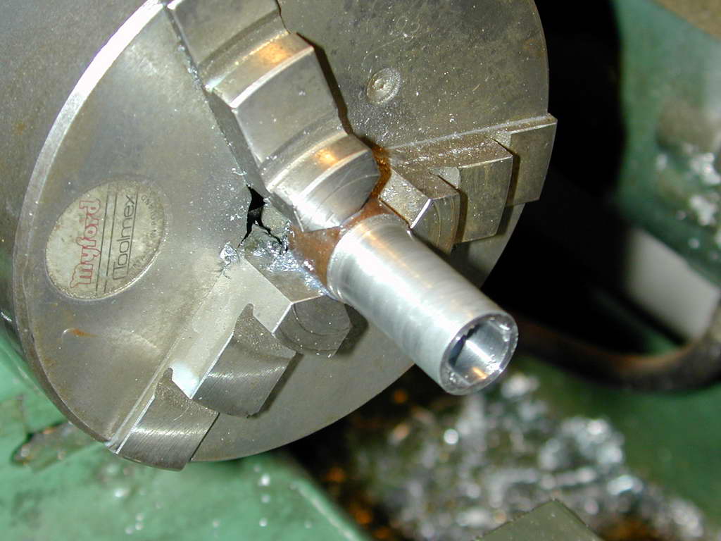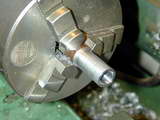 - A length sufficient for the cylinder, part-off allowance, and a chucking stub si set in the 3 jaw chuck and reduced to 9/16" diameter (not critical--we'll bore the crankcase to suit). It is then center drilled, and drilled through undersize in stages: 1/4", 13/32", and bored to the final size of 7/16" (again, not critical). As the finish size is approached, the boring bar is run through a couple of times at the same setting to allow for spring back. It's amazing how much these "no-cut" passes remove!