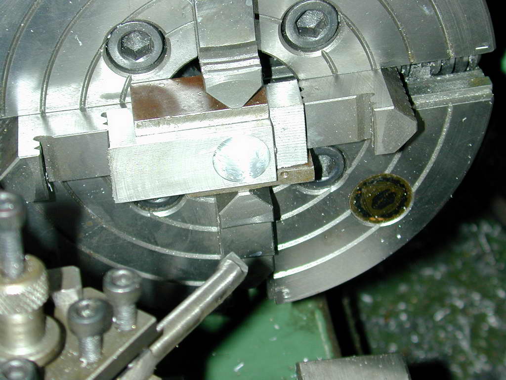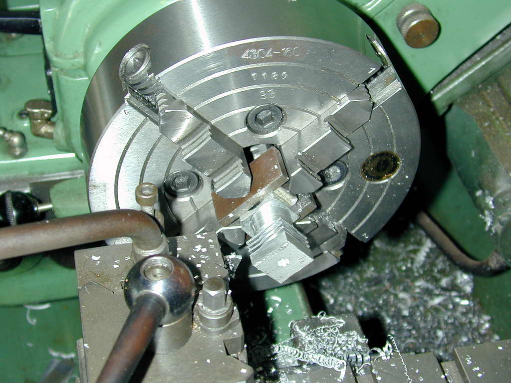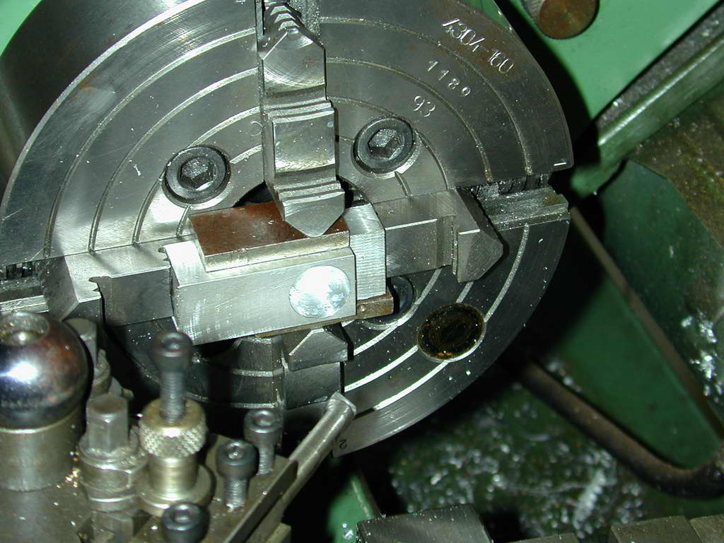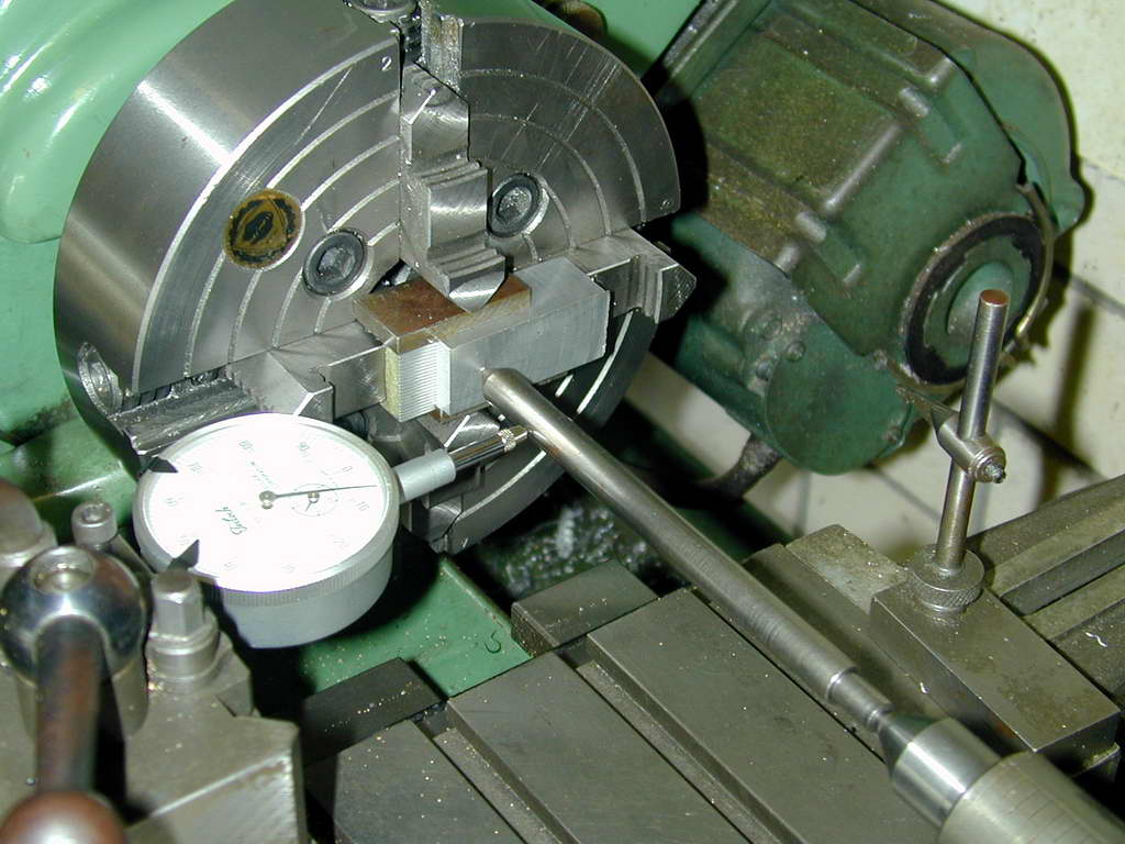- The chuck jaws are returned to normal orientation and the bar setup to bore for the cylinder. Again, pieces of packing protect the case surface and one bridges the bored hole. Make sure the scribed line at the 3/4" mark can be machined down to comfortably. I've used a plunger DTI to center the block. Rest the plunder against a face and rock the spindle to obtain a minimum reading, then adjust the cross slide to zero the DTI. Wind the DTI off the work, rotate the chick 180°, than lift the plunger and wind back onto the part. Note the deflection from zero, figure out which way the jaws need to move to correct it, then adjust to split the error. Re-zero and repeat to check the opposite side. Do this until the measure difference is under a thou with both jaws tight (but not crushing tight). Now repeat for the other two faces.