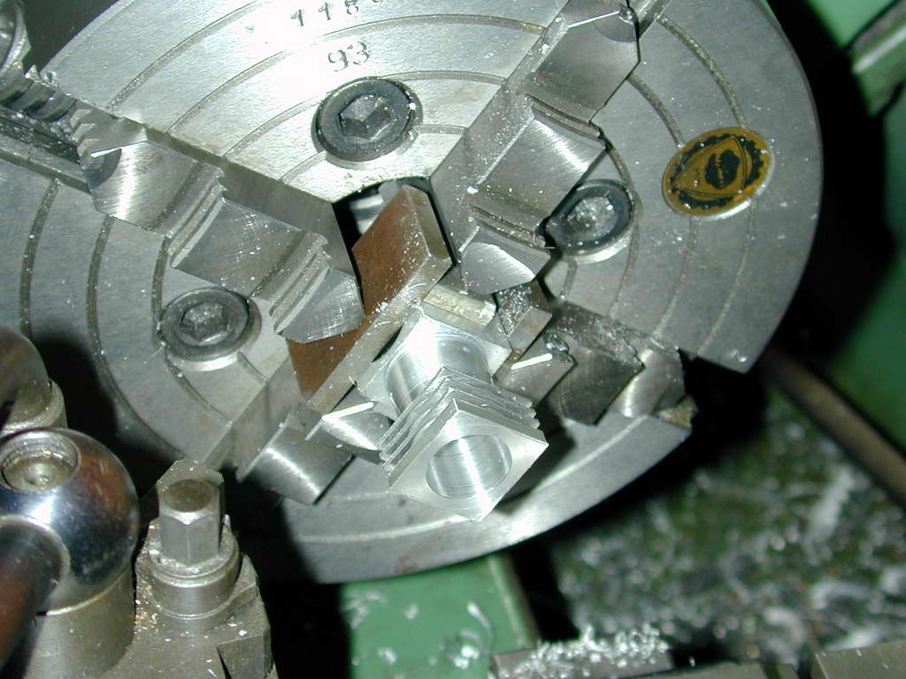 . Turn the lower section to 11/16" diameter between the scribe marks. Now face back to the top scribe mark, and cut a cooling fin groove to leave a top "fin" 1/8" thick with a 1/16" wide parting tool. Measure the exact width of the groove your tool makes, and the length of the section under this groove. Now figure out how thick the three fins will need to be to equally space them out and cut them, taking it slow especially while taking the interrupted cut on the bar corners.