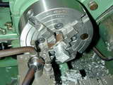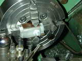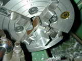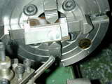 - Layout comprises 5 scribed lines; the first close to what will be the bottom of the case. The remainder are measured from this at 3/8", 3/4", 1-1/4", and 1-21/32". A center-pop mark is then made in the middle of the block on the second line and the block setup in the 4 jaw chuck with a "wobbler" to get the block to run true. It's important that the blind bore we're about to make is at 90° to the axis of the block so that the crankshaft and cylinder are correctly aligned for minimum operating friction. In this photo, I've reversed two of the chuck jaws and pressed the bar firmly back onto the jaw faces to achieve this. Be careful when you do this that you can still drill through the centered block for the rotor pin and not hit the reversed jaws!
