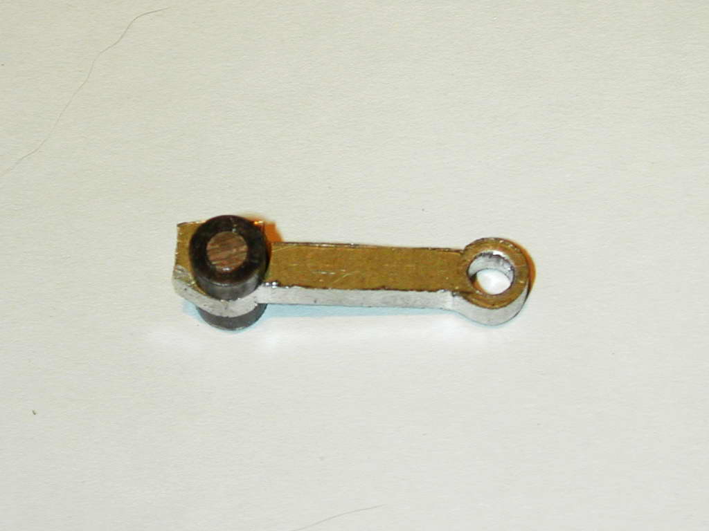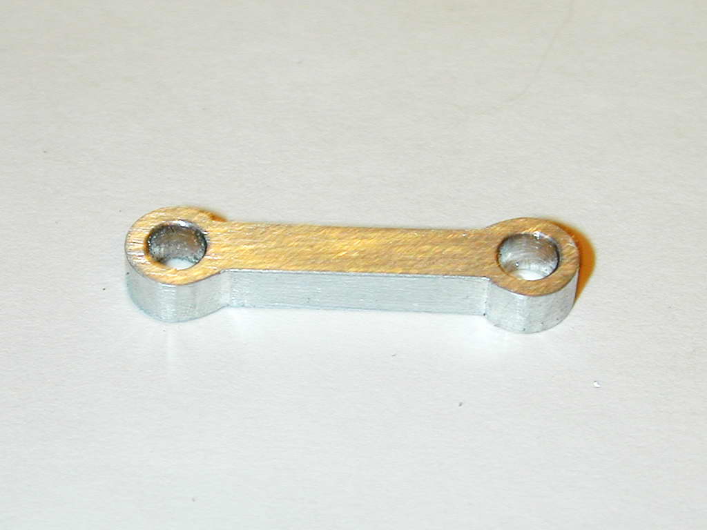- Finally, the rod is polished to ensure all file marks are removed (not quite done yet here--as this photo shows). The reason for polishing is to remove points from which stress cracks may propagate. A small rod for a glow motor like this is not heavily stressed, but it's still a good idea. Also remember to lightly de-burr the rod holes, making one slightly deeper than the others. This one is for the intersection of the crankpin and crank-web which will present a small but significant radius.