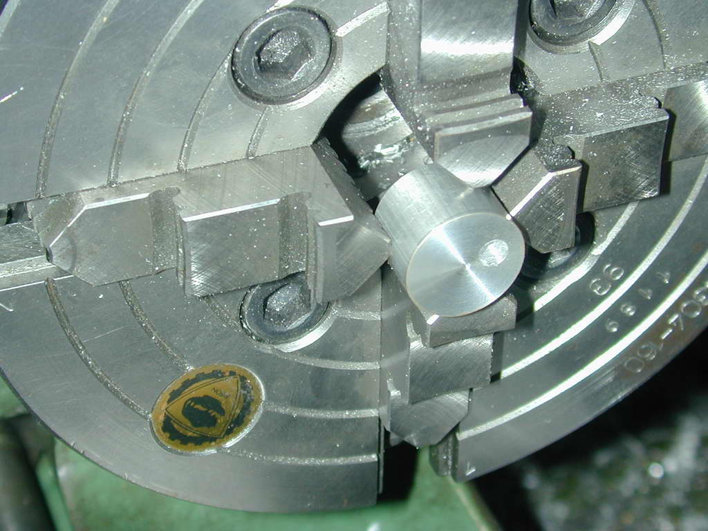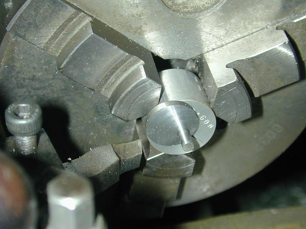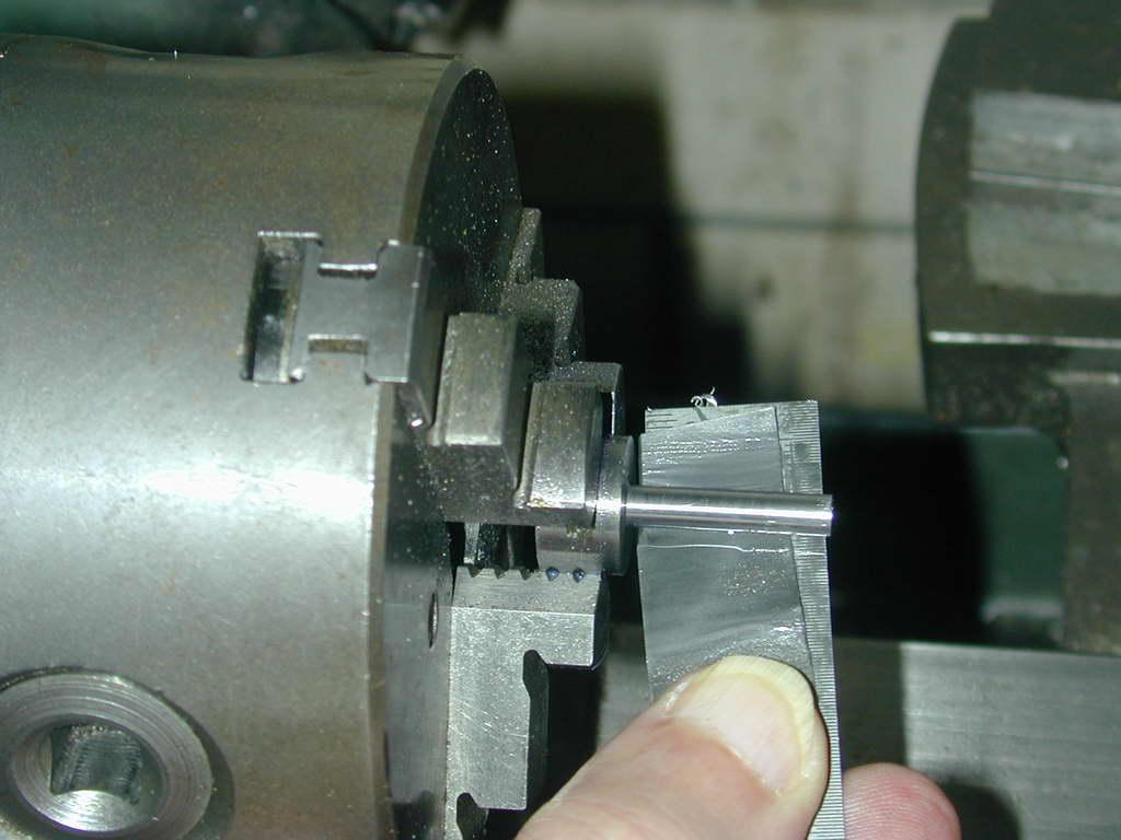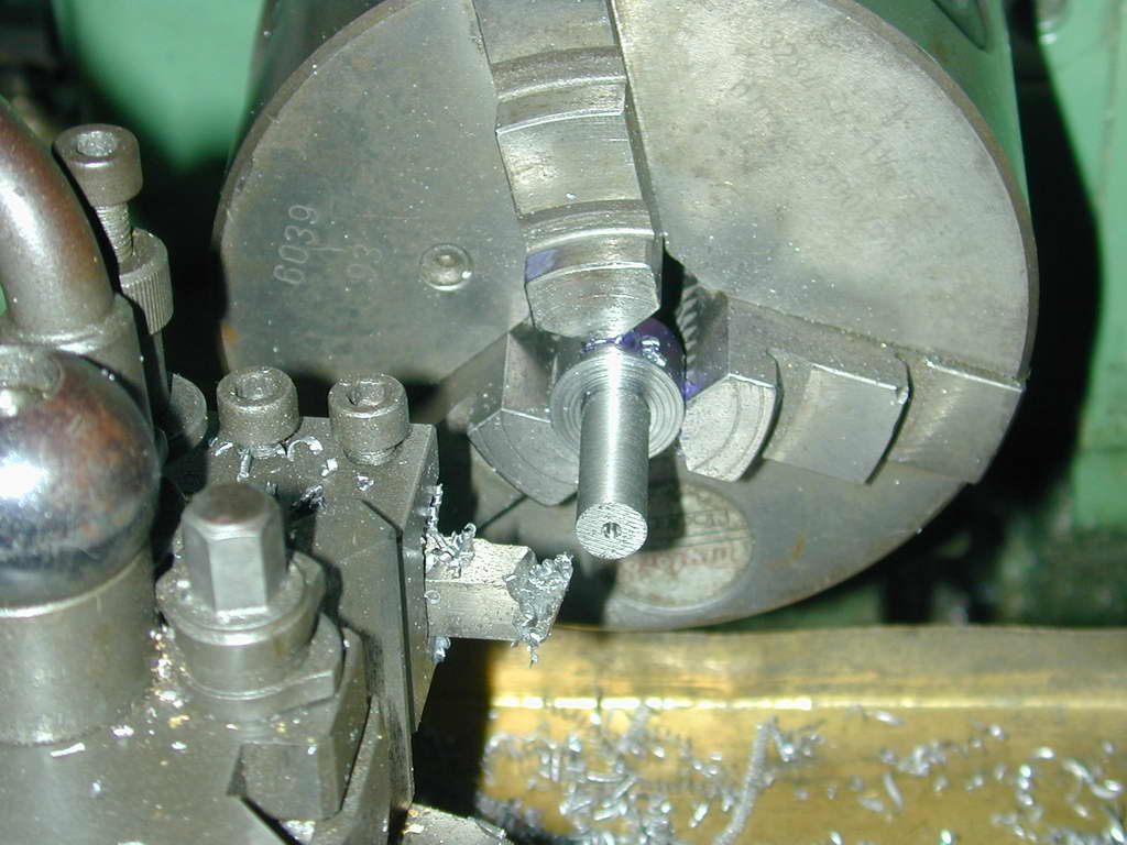 - A length of 5/8" 12L14 sufficient for the job, plus 1/32" for finishing is sawn off and chucked so that the full journal protrudes. it is then reduced " dit is a tight fit in its bearing. It does not matter if it will only just enter the bearing partially, as we must polish it anyway.