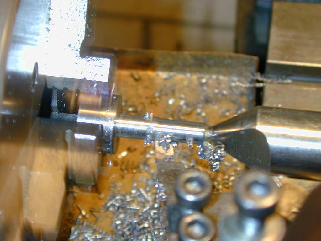 - The pin is formed by progressively taking 0.015" wide cuts from the OD down to a point where the "interrupted" cut noise just disappears. Continue until the crankwek is withing 0.01" of finished, then make longitudinal finishing cuts untile the pin is a firm sliding fit in the conrod (which is why we made the rod before the shaft). Finish to a free running fit in the same way you finished the crankshaft.