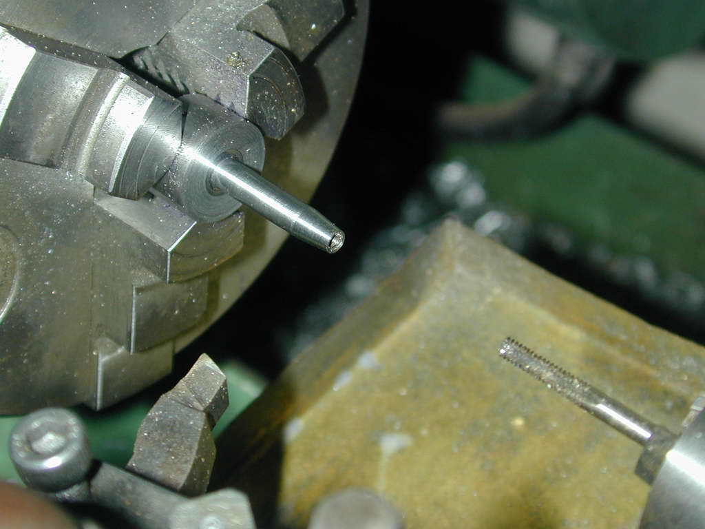 - Push the bushing onto the shaft and lightly scribe a mark at the end of the bush. Now taper the shaft for the prop driver. I have a number os shop-made D-bit tapered reamers and selected one with a 14° taper for this job. Finally, the shaft is drilled #43 and tapped 4-40 for the threaded stud. This is easier, stronger, and more crash-worthy than making the shaft in one piece.