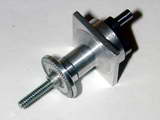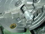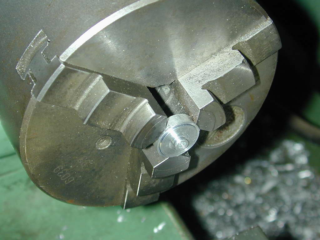 - A slice of aluminium is chucked and reduced to provide a stug 3/16" in diameter, 1/8" long that will accurately locate and center the props I intend to use (as the 4-40 stud would rattle around in the prop shaft hole of all commercial props in the 6 to 7" diameter range). Note that the blank is not drilled at this stage.