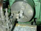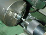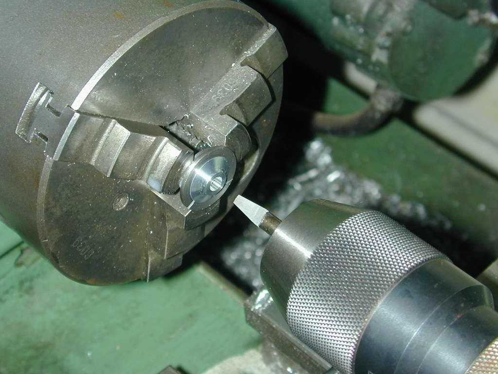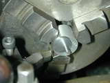 - The hole is lightly countersunk to allow the web to rest firmly against the face, then removed and cut on a diameter projected through the center of the hole with the cut entering from the far side--ie, the sectio where the hole is closest to OD of the jig will remain un-cut. This provides adequate clamping force for small shafts, provided only light cuts are made while the pin is being turned.