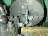 - Photo #5 shows the crankpin jig being setup in the 4 jaw chuck, offset by the throw from the lathe axis. This means that the wobble measured by a DTP resting against the end of the aluminium jig will be equal to the stroke. The jig is drilled undersize, the drilled 3/16". There is no need to ream this hole.