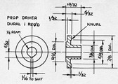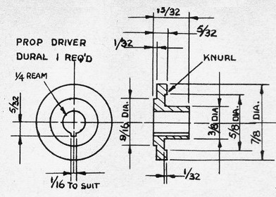 Machining this component is straightforward and where the keyed drive is used, the keyway can be filed by hand to suit a McCoy Redhead key. However, if the flatted shaft drive cannot be avoided, the prop driver should be drilled 1/8 inch through the center and the hole then filed out to suit the shaft. By filing the flat side of the hole first and then cutting the remainder to suit, a concentric fit can be achieved with a little care.