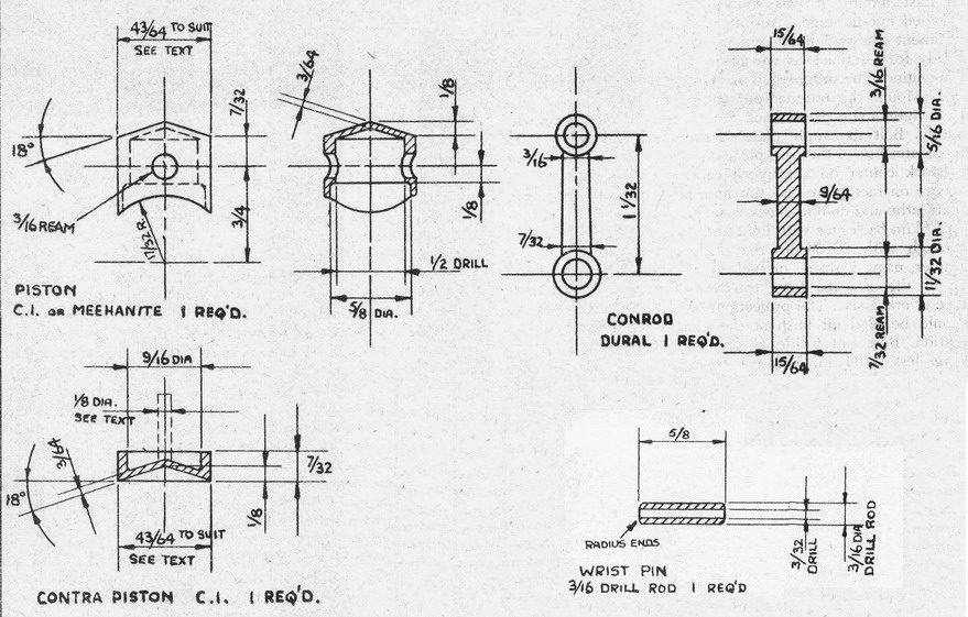 - Try part in cylinder and tap lightly into position taking care not to tilt or jam the parts. At this stage the engine can be partially assembled and it will be found that the 1/8 inch shank on the contra piston will project through the compression screw hole in the head. Clamp a prop onto the crankshaft and, with a little oil in the cylinder, flip prop to check that contra piston moves without using excessive force when a hydraulic lock occurs. Tap the shank end and flip repeatedly until satisfied, then remove head and check for compression leakage past contra piston. If the fit is definitely too tight, the 1/8 inch shank can be used for chucking, while the OD is eased slightly with a small oilstone. It is unwise to use emery paper. Having achieved the desired fit, the shank can be removed and the part gripped lightly in the chuck for cleaning up interior.