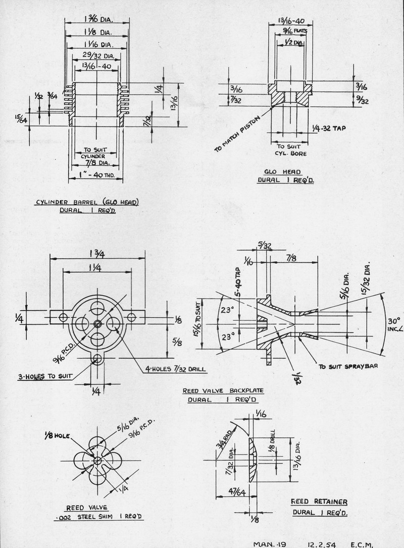 Finally, on the subject of intake diameters, larger bores may be used with success in conjunction with reed valves than with other types, and the 5/16 inch bore specified will be found to give sufficient suction for general use. A reduction to disappear with running, if it is not obvious and, when fitting, a half-dozen .005 7/32 inch diameter will give a very high fuel lift and make the needle control more sensitive, but will detract from performance. A good plan is to start small and increase the size as required; however, the drawing size will keep most people happy. A short intake, incidentally, is an advantage with this type of valve, and a long one does not improve fuel flow as with normal valves having fixed timing.