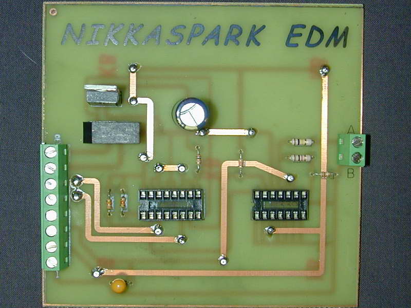 This two-sided PCB was made by Nick using a CAD layout program and printing the positive image of the lands onto photo-quality paper in his laser printer. The paper and printer toner were then ironed onto the copper-clad board, fusing the toner to the copper. Next, the board with attached paper immersed in hot water. This softes the paper which can be pealed off leaving the toner behind as the etch-resist. The Nikkaspark EDM trade-mark