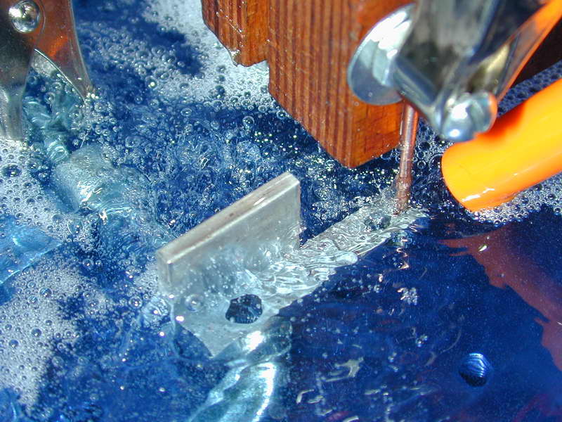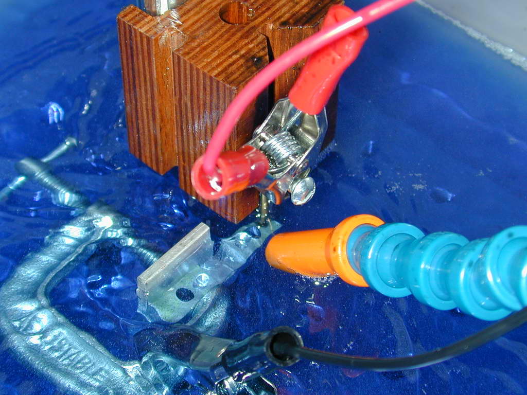 Pritty pictures, aren't they? The test piece is clamped to a piece of hefty angle screwed to the work holding plate. A length of 1/16" OD brass tube has been clamped vertically to the insulated ram block and visually aligned on the broken tap. This must be done "dry". Every schoolboy—and probably a few schoolgirls as well—knows that light gets bent when you look at things under water, so alignment has to be done before the work is submerged. You will also need to lower the level to inspect progress. The quick-fill and empty feature is suddenly starting to sound better and better. Anyway, with the generator clamps applied, the pot is used to slowly lower the ram until sparking starts. The book says "adjust for the sound of frying bacon". This was quite easy and very little adjustment was needed—none, in fact! The glow of sparks is visible under the surface and if you stop the pump, black gunk is seen rising at an alarming rate.