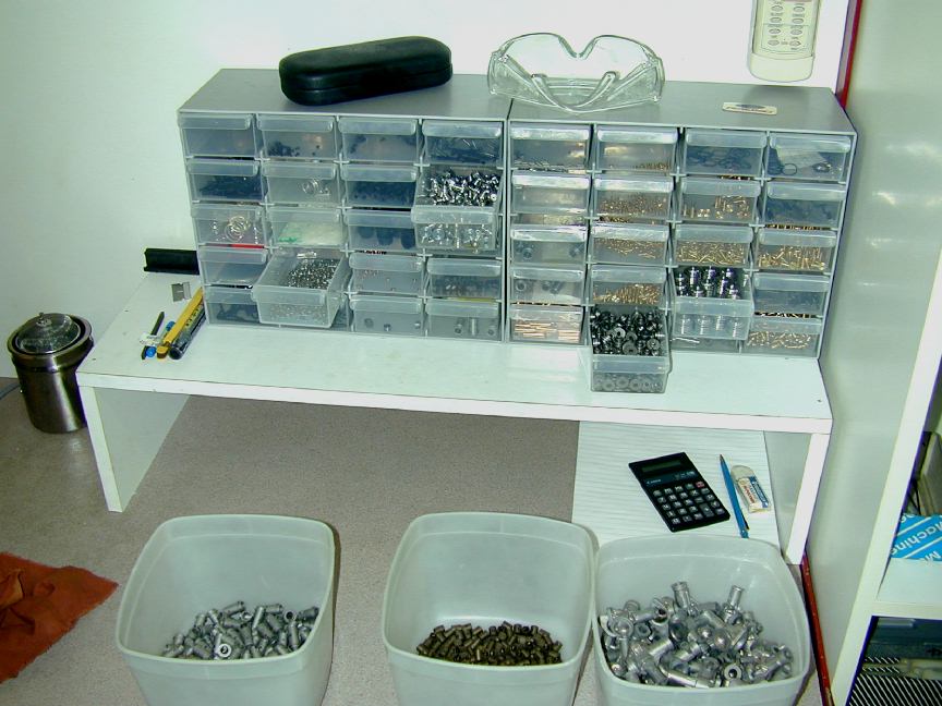 The engine was designed with CAD, and all tolerances worked out so that no "mix and match" assembly would be required—even when all tolerances stack up the wrong way, Peter is confident that the engine will still perform to specification (even so, all engines are test run by Peter before packing and shipping). The photo here shows the parts bins for the first production run of approximately 147 engines. The final production number may be far higher as sufficient material and specialized tooling (like taps etc) have been stockpiled to permit some 3,000 engines to be built.