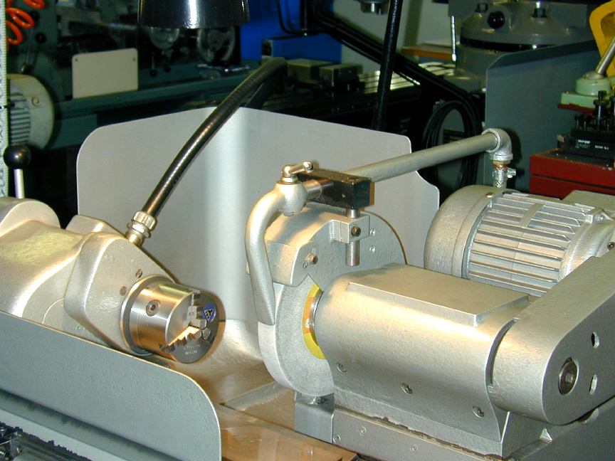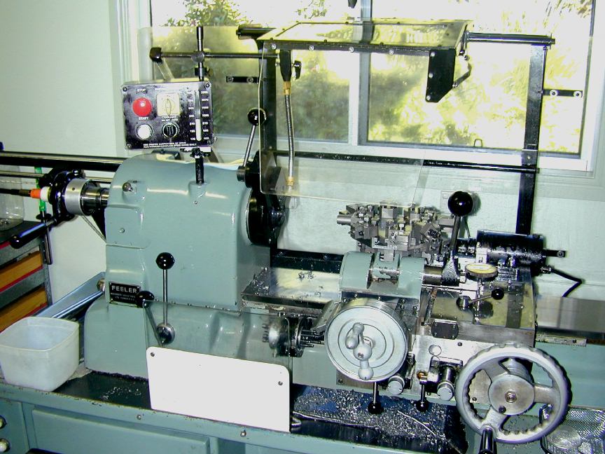 Where to start describing Peter's shop? First, it's roomy, with large glass windows around two sides that provide great natural lighting from Peter's garden that abruptly changes to bushland, being situated just below the crest of what Ozzies would call a mountain range and other would call hills. In the center of the shop is a cluster comprising mill, tool-room lathe, external grinder, and surface grinder. Grouped around this cluster are two turret lathes: a Swiss Schaublin 70 (Peter's favourite), and a Feeler (which is a good copy of a Hardinge), plus benches, press tools, Sunnen precision hone, and precision drilling machines. An assembly station, come design bench, and generous storage facilities completes the picture. Compressed air is delivered to the machines needing it (like the feed mechanism on the small turret lathe). In fine attention to detail, the air lines are painted yellow with oil/water traps at all outlets. The pictures below show some of the machines.