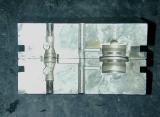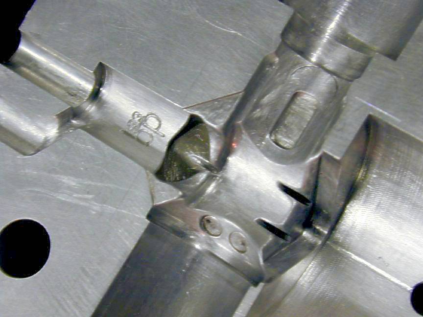 These shots show a close-up of the venturi side of the die, and how the three plugs will sit in their openings. In the left-most, notice the channel below the opening that will support the front of the bore plug. This provides the sprue through which the wax will be injected. This sprue is retained and joined to a spider permitting five cases to be invested together, and finally, provides the entry for the molten aluminium. The shot on the right shows how the plugs enter the die cavity. The Schnurle boost port is uppermost on the cylinder plug and the split lines marking the slide-in piece that permits the plug to slide out independent of the port piece is visible, if you look closely enough.