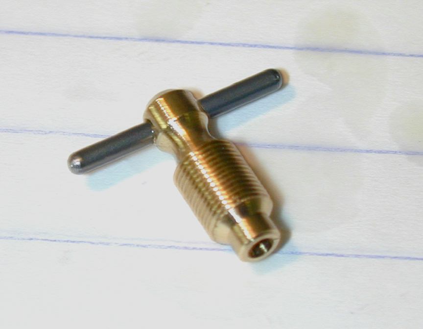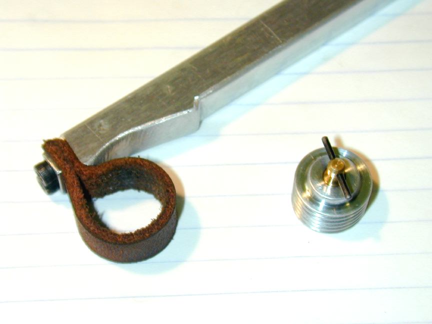 The compression screw is brass, with a fine thread and comparatively large diameter to give a very pleasant "feel". Notice the hollow point. Years of experience with Taipan led to this little touch (and one I first heard from David Owen and have mentioned in these pages before). The center of the contra-piston will probably be slightly raised. So would the tip of a "flat" comp-screw end. The result of these two not-quite flat surfaces registering against each other is a comp-screw that will unscrew under vibration every time. The hollow point allows any slight pip on the contra-piston center to be compensated for, reducing the likelyhood of it unscrewing while the engine is running. As a further precaution, a nylon screw in the cooling head gives a bit more friction and a nice feel. Have another look at the full size photo, paying special attention to the tomy-bar ends. The tommy-bar is 1/16" music wire, with the ends ground spherical on special tooling built by Peter. Not only does this look good, it assists the press fit and provides a nice operator feel.