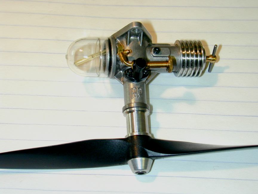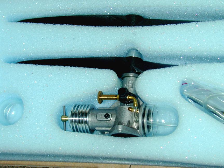 As I write this in late May, 2004, the PB .33 is ready to ship. Here we see a platter of engines ready for test running, and the packaging. Note that each engine comes with two propellers (a 6x3 and a 6x4), a spare fuel tank, O rings, a set of Allen keys, and an extra length of fuel tube. All are packed in a generous foam insert. Operating instructions are on a double sided A4 sheet. The price is admittedly high: A$500, plus shipping. There will be no agents, no bulk deals, and no discounts. Peter knows that many will call this "overpriced", but he has considered what it takes and has taken to build them and priced to make the engine give him a modest return on this time. If the market votes a resounding "no way" to the price, he is quite prepared to make no more of them. If this seems extreme, there is a precedent: he confirmed the story about an entire production run of Taipans being used as fill under the concrete floor of the Adelaide Taipan factory—he should know, as he helped pour the concrete over them! So are they worth it? Well that's up to individuals to decide. The engine is not a beginners' engine—no small diesel is, really. These are engines for the connoisseur and are intended to be flown, not sit in a glass case—though I don't doubt that many will do just that. I have no connection with Peter, or this venture—I'm just another customer who feels that the engine will give me my $500 worth of joy. The rest of the world will make up their own minds and time will tell...