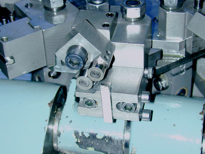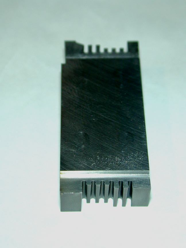 This, obviously, is the tool used to profile the cooling heads. Naturally it's hardened tool steel. Now look closely. Note that each cutting blade has the correct front and side rake, and the inside and outside corners are perfectly rounded to form both fin and gap profiles. I was trying to imagine how I'd grind this on the Quorn until Peter put me out of my misery saying it was wire-cut with an EDM. The other end of the block has a like shape—makes sense; after the machine is programmed to cut one, why not bash out another on the other end as a spare and to increase the time between sharpenings. Tools like this (and a honkin' big lathe) reduce to seconds what would take me tens of minutes, a fin at a time on the poor little Myford.