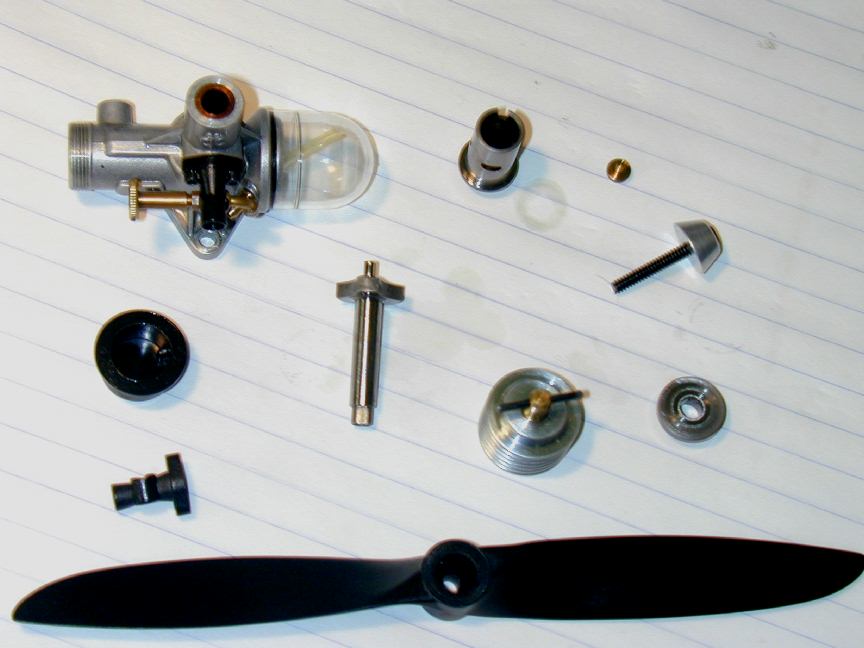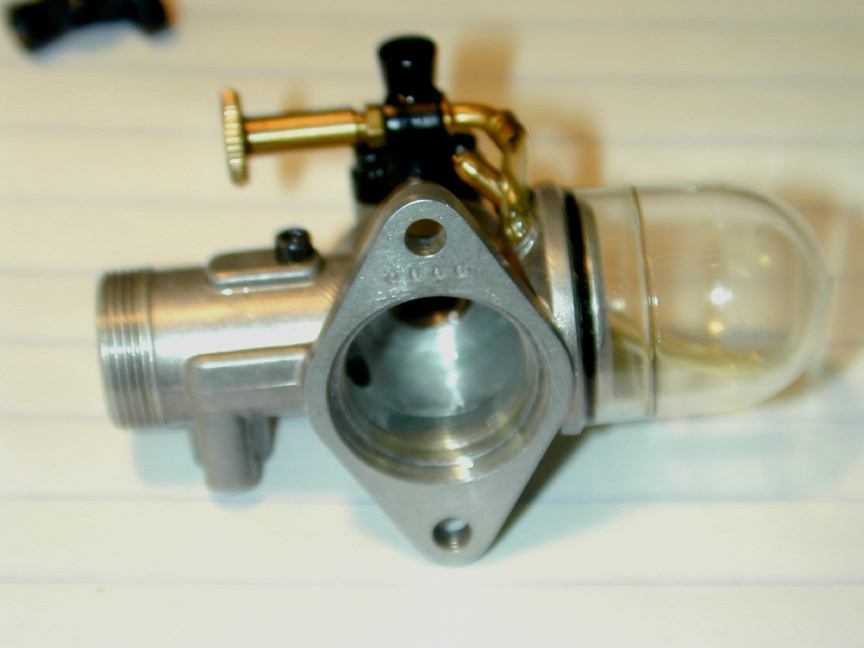 The inlet is an injection moulding that mounts to what we'd usually call the side of the engine with 1-72 cap-head screws. Knowing a thing or two about injection moulding, Peter was very particular in the plastic he wanted for the venturi and backplate. Unfortunately, it was only available from a single supplier in USA, and cost over 100 times what might have been used if this were not a no-compromise engine (oh wait, I forgot; this is NOT a no-compromise engine. yea, right...) but Peter did not weaken, he ordered the plastic he wanted for the job regardless of the absurd cost. Now, about the inlet position. While it can certainly be mounted with the cylinder poking up like an Arden Atom, Peter sees it mounted as a side-winder in a little control liner. This places the venturi upright, with the tank on the outside of the circle for centrifugal feed and would enable a very neat twin-cheek cowling to be fitted. Notice how the tank fill nipple would be above the filled position, so no leaks. There was a short lived British diesel called the Lion that used a similar arrangement of tank and cylinder in the late 40's. and Sparey designed a similar engine during World War II, although both disguised the tank as another cylinder head. Peter's tank is a crystal clear plastic injection moulding, snap fitted and sealed with an O ring. The little embossed ring on the tank allows it to be cut down for shorter engine runs in free flight models (each engine comes with two tanks, so this is not a drastic measure).