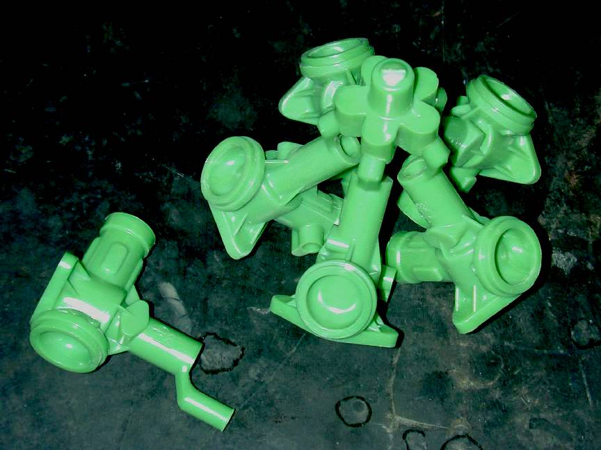More of the die maker's art. Above, from the left are the die for the fuel tank, the combined venturi and backplate, and on the right, the die for one of the pair of very elegant propellers Peter designed for the 0.33. The prop bears a strong resemblance to the Taipan range of props with wide cuffs reminiscent of the "Larabee" blade form (designed for the highest possible efficiency at the lowest possible speed). Obviously the prop die must separate around the periphery of the blade shape, but what happened in the middle? If you examine commercially moulded props, you can gauge the quality of the dies by how the lower trailing edge meets the higher leading edge of the opposite blade across the side of the hub. Many are a simple vertical step (including the Taipan props of yore). Not infrequently, this will leave a step, or a flash on the prop. Peter wanted his props to be as blemish free as possible, so notice how the TE sweeps elegantly up to the LE. The result is a very attractive and blemish free job. The "roughness" visible at the tip of the die faces is intentional. This provides sufficient passage for air to escape as the glass reinforced polyamide flows in.