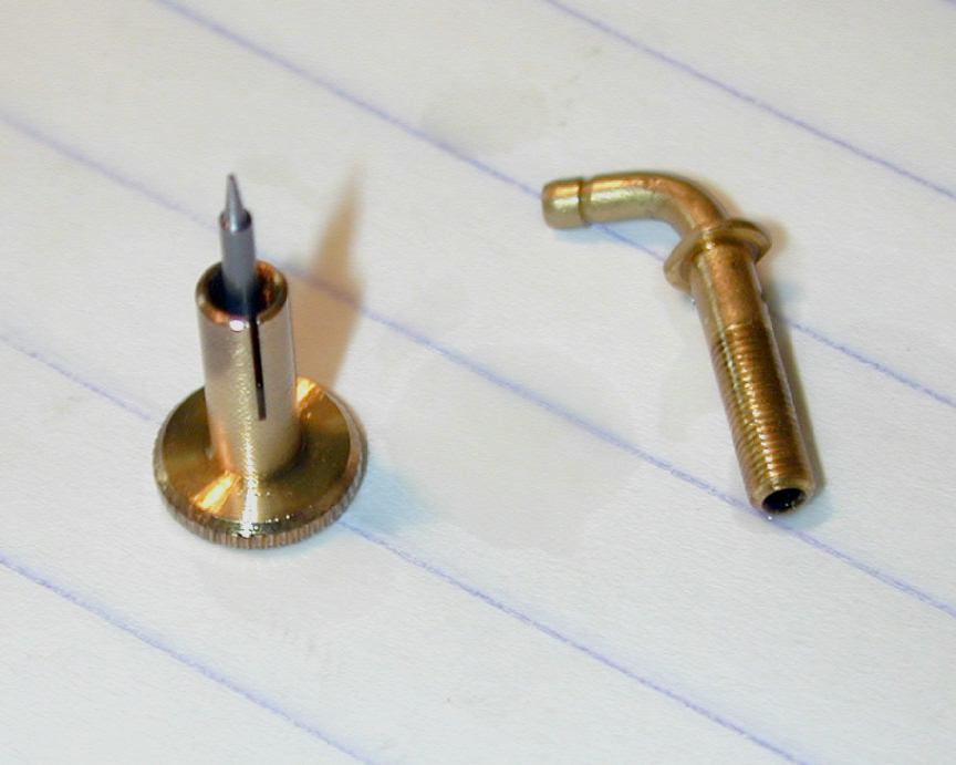 After chatting with Peter for a few hours and examining the engine, I wanted to call it a "no compromise" product. Peter would not have it, saying everything is a series of compromises. Maybe so, but look at the needle. It is ground from 3/64" music wire on the same center grinder that grinds shafts and pistons. The needle is just long enough to meter through the jets, then quickly steps out to full diameter to minimise the possibility of air leakage. The needle is pressed into a split thimble with such accuracy that there is no sign of binding as it is screwed into the spray bar. The very tip of the needle is not sharp, nor flat, but carefully rounded. The top of the brass thimble has a little circular depression as an indexing mark. This is not cone-shaped, as it would be if touched with a drill bit, but spherical for no other reason than pure attention to detail. Think I'll stick with my no-compromise theory.