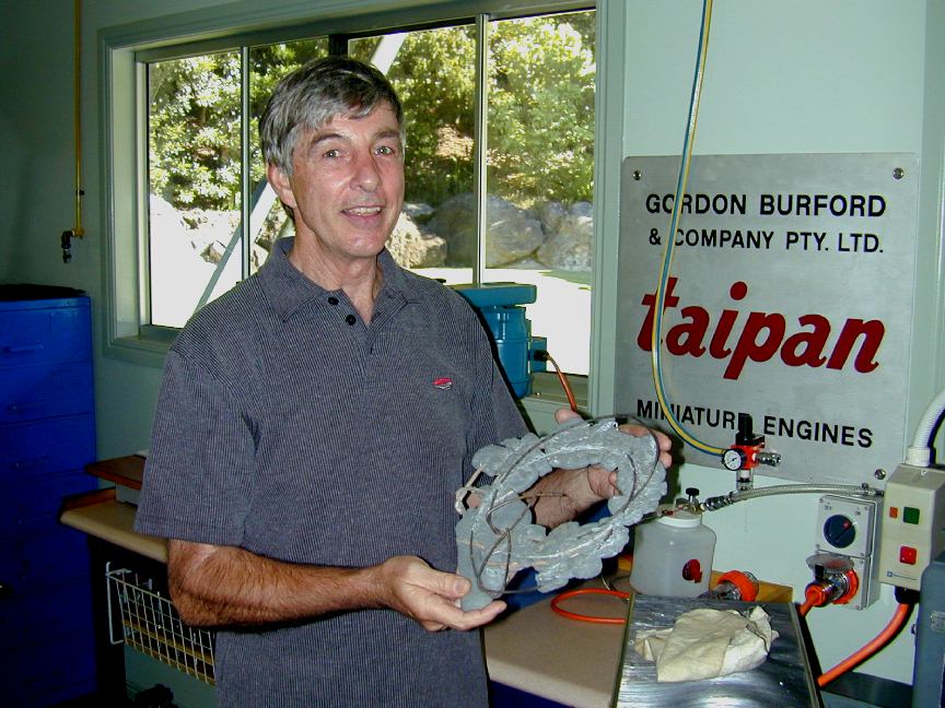 Some people retire, then decide what to do with their sudden increase in spare time. Master machinist and die maker, Peter Burford, knew what he wanted to do, but realized he'd have to retire to do it right—you gotta admire that kind of style! Peter's father is the Australian model engine icon, Gordon Burford, designer and manufacturer of the Taipan, Glow Chief, Gee Bee, GB, Sabre, Stunt-Mota, etc ranges of engines. The story of Gordon's life-long passion has been told in a number of publications. Perhaps the best of these was a series of six articles by Ivor F that appeared in Model Engine Word beginning with Volume 4, Issue 4, Number 40 of August 1977. Omitted from the tale is the fact that Gordon was joined by son Peter in the 60's, initially as an apprentice machinist, ultimately as manager of the plant up until Taipan called it a day. Even after that, while Peter was operating a die making and injection moulding business on Australia's Gold Coast, he watched his father's small production run engines (like the Burford Deezil, CIE, original Sabre 2.5, etc) and must have thought it all looked like fun.