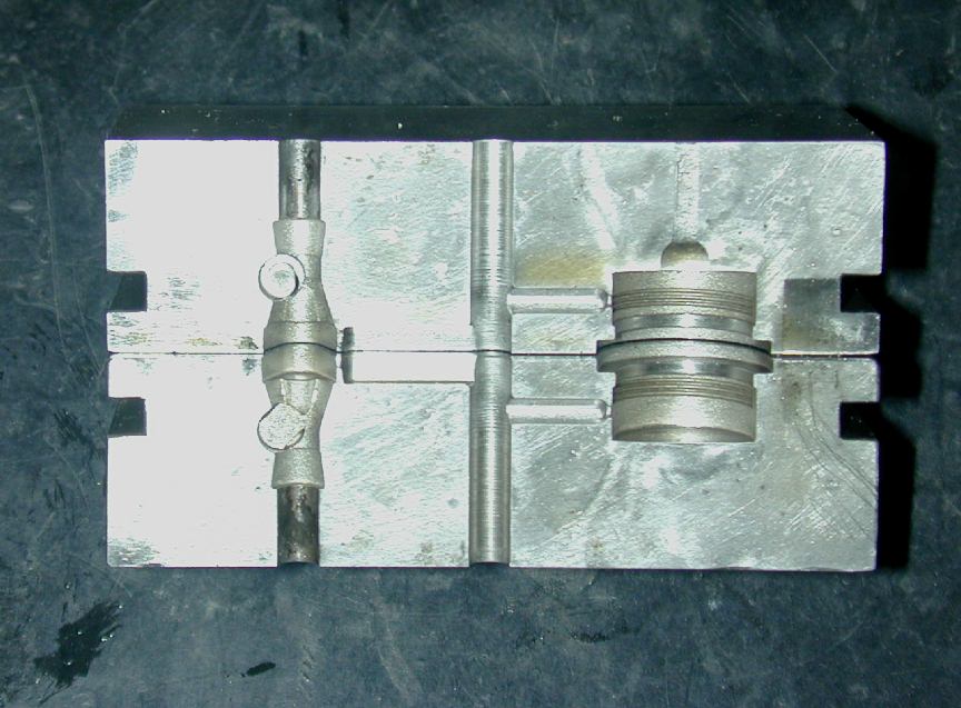 This is the die for the crankcase investment wax. I barely know what we're looking at here—but I'll try to explain. In the middle are the two halves of the die that separate around the case vertical fore-aft center plane. As all parts of the case around this plane are simple curves, these halves will separate from the wax pattern. Note that the halves are keyed together with four dowel pins in the corners. Just inside two of these are two holes which take the clamping screws visible in the upper left corner of the shot. The large, stepped, circular plug at the top enters from the rear of the case. The steps form the inner case cavity and the main journal bore. Beside it is the plug that enters from the bottom and will form the inner surface of the fuel tank cradle. To the immediate right of the die is the plug that forms the cylinder bore. Note that it has three protrubances that will form the Schnurle ports in the inner case walls. Obviously, these would prevent the plug from being removed were it not for the fact that each bump is a separate sliding piece of metal that keys into the plug. This allows the circular part to be slid out leaving the lumps behind. Each can then be moved sideways into the space vacated by the plug, leaving the perfectly finished transfer port indent in the wax. One of these is sitting between the die and the plug. The bottom of the circular plug portion is concave to neatly wrap around the rear entry plug. To the right of that is... I dunno; beats the 'el outa me lieutenant. I've run out of die holes to put plugs in. Note that each plug has a hole in it, and so does the die. The "L" shaped thingies lock the plugs in place and assure their correct positioning. When Peter pulled the die apart, each of these slid freely from its hole, but with a distinct "pop" showing how close the fit.
