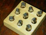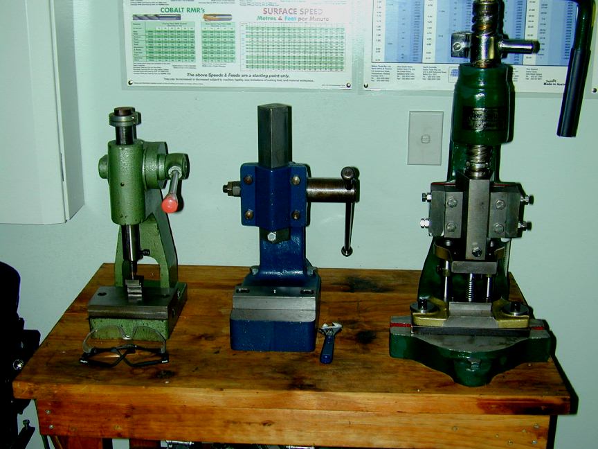 While on the subject of numbering, here are the number punches used to stamp the cases. They look spectacular, but began life as four sets of common, garden-variety MSC 1/32" number punches. First, Peter ground the sides very precisely in relation to the location of the number so four can be stacked to give the correct number spacing and the four-digit number stamped at once (explaining why there are four sets). Next, Peter painstakingly measured the baseline height of each numeral and ground the top and bottom of the punch so that all were exactly the same height, and all numbers shared a common, precise baseline. He says that as expected, no two were alike—all had to be individually measured and ground. He rates the surface grinder and magnetic chuck as one of the most essential pieces of workshop equipment. There's a matching wooden top for the stand. This prevents rust and all the production tooling (fully hardened tool steel) is kept in an old wooden wardrobe (ex Post Master General, if I recall correctly) for just this purpose.