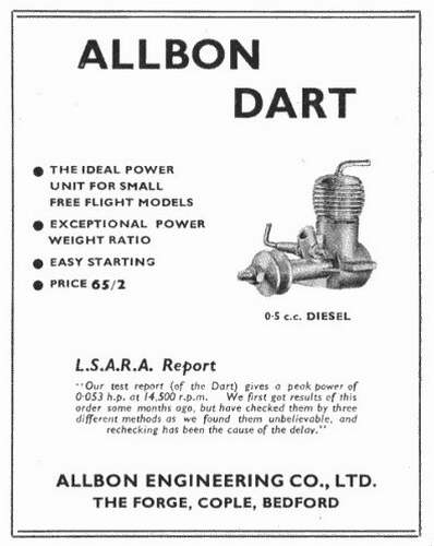Initially there was no mention of any involvement at this time on the part of Davies-Charlton (who continued to advertise separately), creating an impression that the Allbon engines were still being independently manufactured by Allbon Engineering, albeit at the Cople location. However, in his "Accent on Power" column in the April 1952 issue of Model Aircraft, Peter Chinn let slip the fact that the manufacture of the Dart had actually been taken over by Davies-Charlton. It was undoubtedly this move that had permitted the closure of the Sunbury-on-Thames plant and prompted Allbon's relocation to Cople, an odd location for a model engine manufacturer if ever there was one! It appears that Allbon had simply moved his residence and his business office to Cople, leaving Davies-Charlton with the job of actually making the engines.