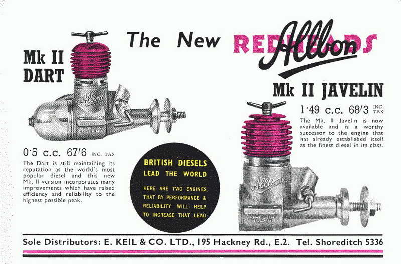 Allbon had started with two successive variants of a very workmanlike 2.8 cc sideport diesel, but had successively added the 1.5 cc Arrow glow motor and 0.55 cc Dart diesel to his line-up in addition to the Mk I version of the famous 1.5 cc Javelin model, which was a highly-regarded diesel version of the not-so-successful Arrow.
