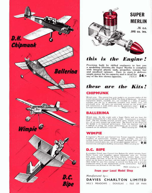 The July 1955 introduction of the 0.76 cc Super Merlin with its red head and spinner plus plastic fuel tank was followed in November of the same year by the introduction of the Super Merlin-inspired 1.49 cc Allbon Sabre which replaced the very popular Allbon Javelin Mk II. Davies-Charlton's re-entry into the kit manufacturing field followed immediately in December 1955. Their first two kits were the Chipmunk semi-scale control-liner and the Ballerina free flight model, both specifically tailored to the Super Merlin. The D-C Bipe control-line biplane kit, again designed for the Super Merlin, was added to the range in August 1956, and finally the Wimpie control-line trainer for the same engine appeared in November 1956. The latter kit was not a success and didn't last long on the market. However, the others all survived for some years.
