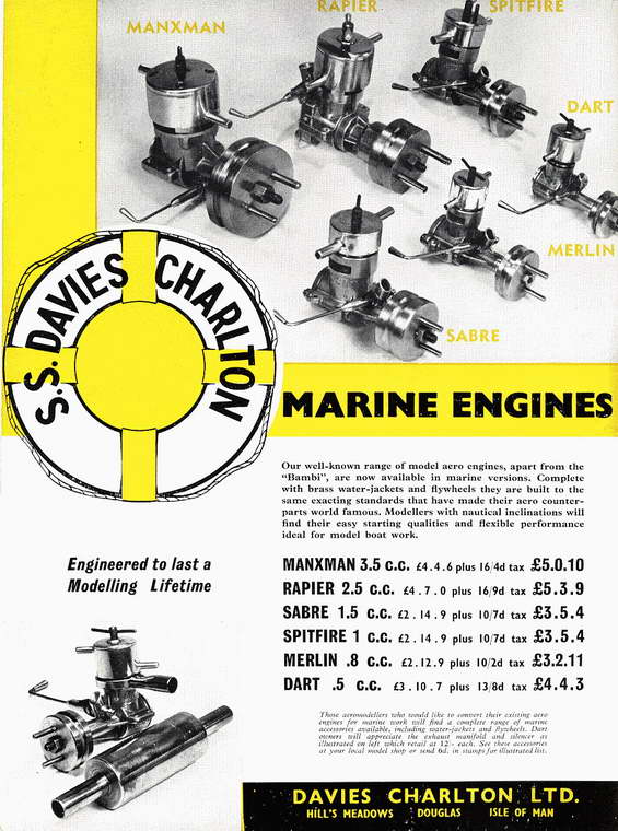 The decade following their relocation proved to be the golden age of Davies-Charlton as model engine manufacturers, since it was during that period that the range established itself as one of Britain's most popular and recognizable model engine marques. Although the company's smallest-ever design, the 0.15 cc Bambi, was only modestly successful in sales terms and served more as a "manufacturer's statement" than anything else, their other sports diesels such as the 0.76 cc Merlin (in standard and "Super" formats), the 1.5 cc Sabre and the Sabre-derived 1 cc Spitfire Mk II (February 1957) quickly established themselves as sport-flier's favourites. In September 1957 the company also entered the popular model boating field in a big way by introducing marine versions of their entire model engine line-up from 0.55 cc to 3.5 cc. Both the range and the market scope were expanding, and business was good!