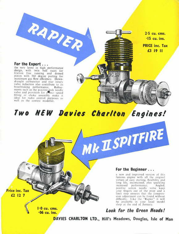 Although the Dart, Spitfire and Sabre "twins", and the Rapier were all initially marketed under the Allbon name, that name was progressively dropped following the move to the Isle of Man, seemingly disappearing entirely in 1958 after lingering for a while on the company's diesel fuel labels. It appears that a gulf progressively developed between Hefin Davies and Alan Allbon which eventually resulted in Allbon parting company with Davies-Charlton in 1959. He initially joined forces with a Mr. Saunders to make the excellent little 0.55 cc AS 55 diesel in the early 1960's before abandoning the model engine field for the optical industry. The staff of Davies-Charlton was subsequently brought up to strength by the addition of Harry Hundleby, who was a former editor of Aeromodeller magazine and was then resident in the Isle of Man.