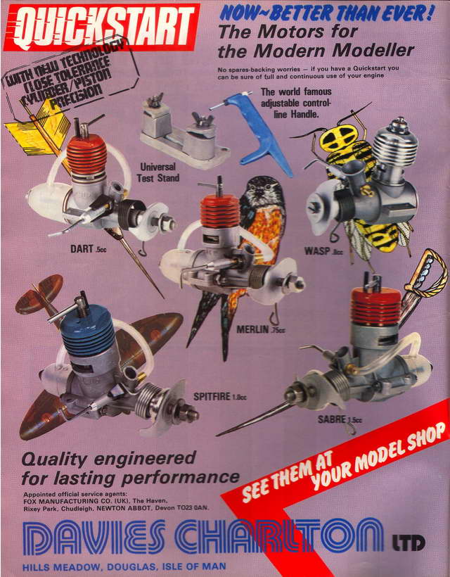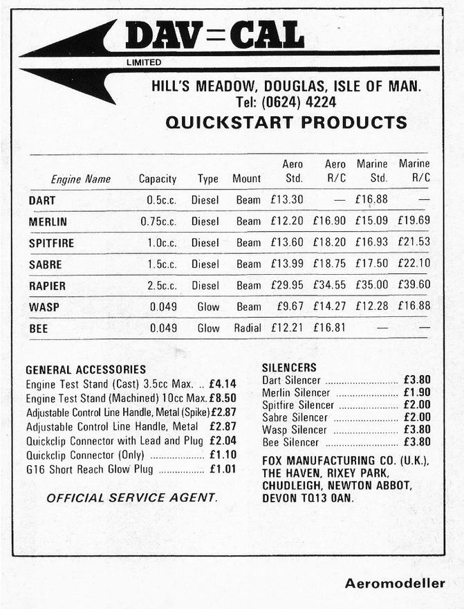 D-C engines were now sold either by the "Model Engine Section" of Dav-Cal Ltd or by another business entity named "Quickstart Products", which in reality was simply another Dav-Cal Ltd division. These two entities both listed their addresses as Lake Road, Douglas and shared the same phone number (0624 74224).