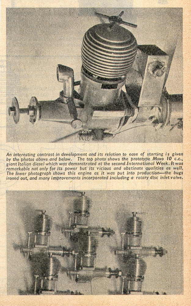 Indications are that the Movo was built in great numbers to cater to post-war demand for diesels in the USA. This early and rather short-lived infatuation of US modellers with the diesel was in no small part driven by articles written in the model press by Jim Noonan. The "D2" designation probably means 2cc diesel as there was also a 1cc Movo D1, although no photos of it can be found. Movo also produced a DP23 9,96cc spark ignition engine and a 10cc diesel. The photo here (from the May 1949 Aeromodeller) shows the rather nautical FRV 10cc Movo prototype and the significantly different RRV production engines.
