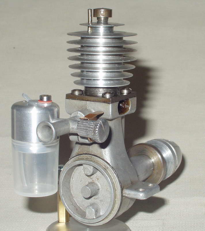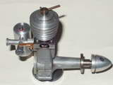 The 2cc Movo D2 was made by Signor Clerici of Milan, Italy, circa 1946. The name "MOVO" comes from Modelli Volanti (Flying Models). The shop was located on a narrow street named Via Santo Spirito, a tributary of the famous Via Montenapoleone. Basically, it is a Yet Another Copy of the Swiss DYNO. There were two models that differed only in the location of the tank and orientation of the needle valve. The first model had a backplate mounted aluminium fuel tank. The vertically oriented needle valve and spray bar extended into the tank from above. On the second model, the venturi was rotated 90° and a diecast "sidewinder" cap for a revised translucent tank attached.
